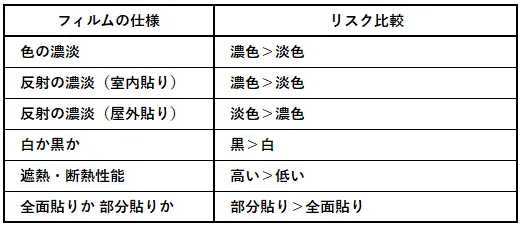 強化ガラスは熱割れリスクが低いですが、既存ガラスの品種把握など、専門知識を持つ業者による現地調査やリスク説明が不可欠です。 なお、熱割れ計算は各フィルムメーカーの専用ソフトを用いて行われ、入力条件が同じであれば結果も同じということになります。つまり設定条件の見極めを間違えれば、異なる結果が導かれるということです。施工可否や適合フィルムの選定は、知識と経験豊富な当社にお任せください。