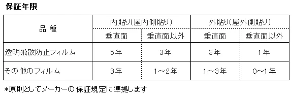 ● 当社は、施工完了日から下表に基づき、本件工事において使用されたフィルムの品質不良起因において、著しい劣化変色または剥離、膨れその他外観に著しい不具合の発生を確認した場合は、当該不具合が生じたフィルムの貼付再施工を無償で実施いたします。